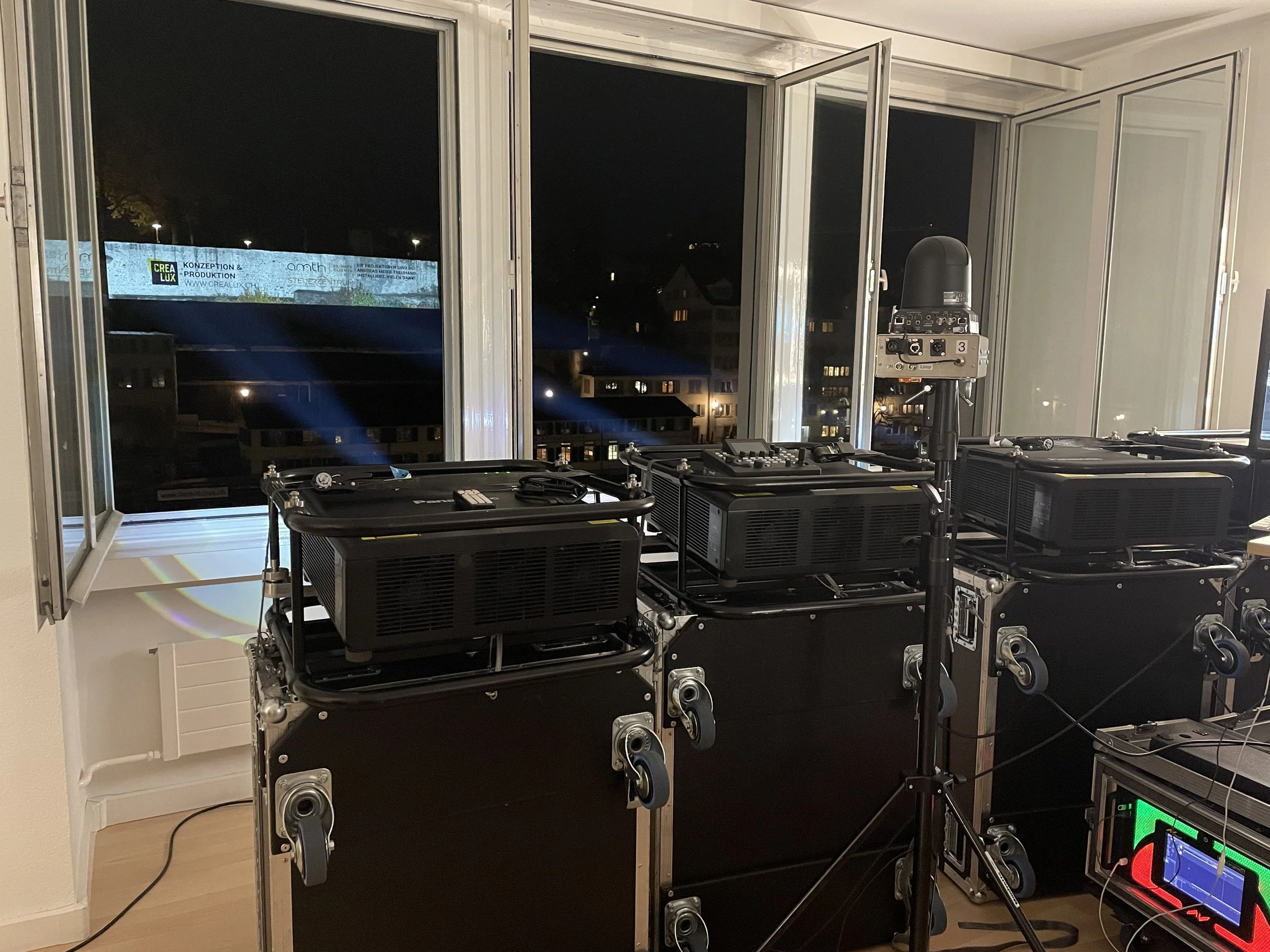 4 Projektoren mit je 10000 Ansilumen und einer Auflösung von 1920x1200px setzten die Animation auf der Projektionsfläche zusammen. Die Distanz von gut 100m von der Projektionsfläche bis zu den Projektoren konnten mit geeigneten Teleobjektiven überwunden werden.